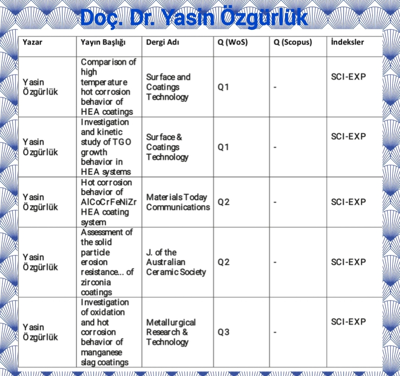 Yasin Özgürlük: İleri teknoloji kaplamalar ve korozyon direnci üzerine Surface and Coatings Technology gibi saygın dergilerde çok sayıda Q1 ve Q2 seviyesinde yayın gerçekleştirmiştir.