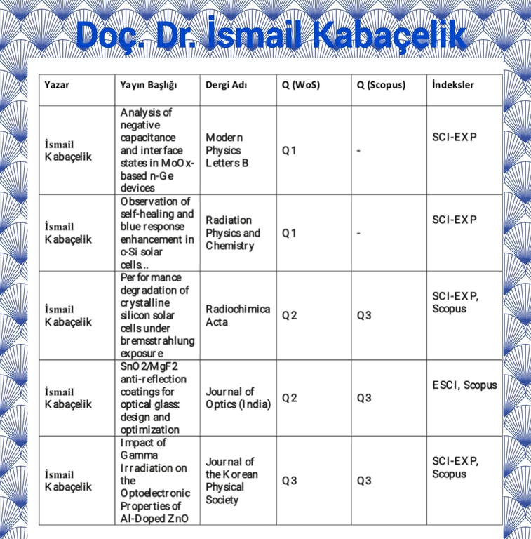 İsmail Kabaçelik: Optoelektronik ve güneş enerjisi teknolojileri alanında Modern Physics Letters B ve Radiation Physics and Chemistry dergilerinde Q1 düzeyinde prestijli makalelere imza atmıştır.