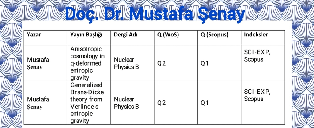 Mustafa Şenay: Teorik fizik ve kozmoloji alanındaki özgün araştırmalarıyla Nuclear Physics B dergisinde Q1 ve Q2 seviyesinde yayınlar gerçekleştirmiştir.