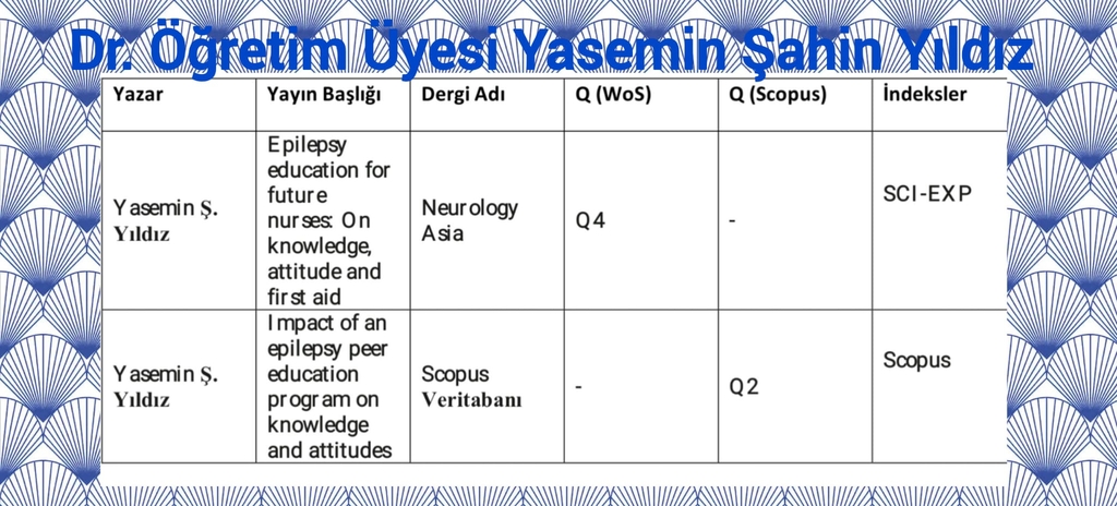 Yasemin Şahin Yıldız: Hemşirelik eğitimi ve epilepsi farkındalığı konularında uluslararası indeksli dergilerde çalışmalar yayınlamıştır.