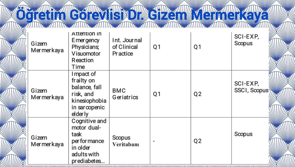 Gizem Mermerkaya: Acil tıp ve geriatri alanındaki klinik çalışmalarıyla International Journal of Clinical Practice ve BMC Geriatrics dergilerinde Q1 kategorisinde yüksek etki faktörlü yayınlar yapmıştır.