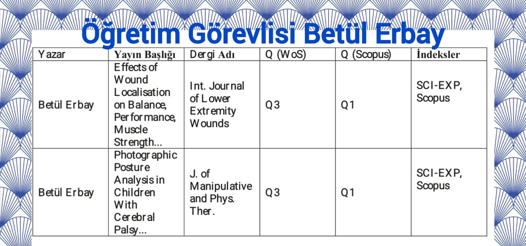 Betül Erbay: Diyabetik ayak komplikasyonları ve pediatrik rehabilitasyon üzerine hazırladığı çalışmalarıyla Scopus Q1 ve SCI-Expanded endekslerinde yer almıştır.