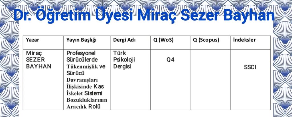 Miraç Sezer Bayhan: Sürücü davranışları ve kas iskelet sistemi bozuklukları üzerine SSCI kapsamında çalışma yayınlamıştır.