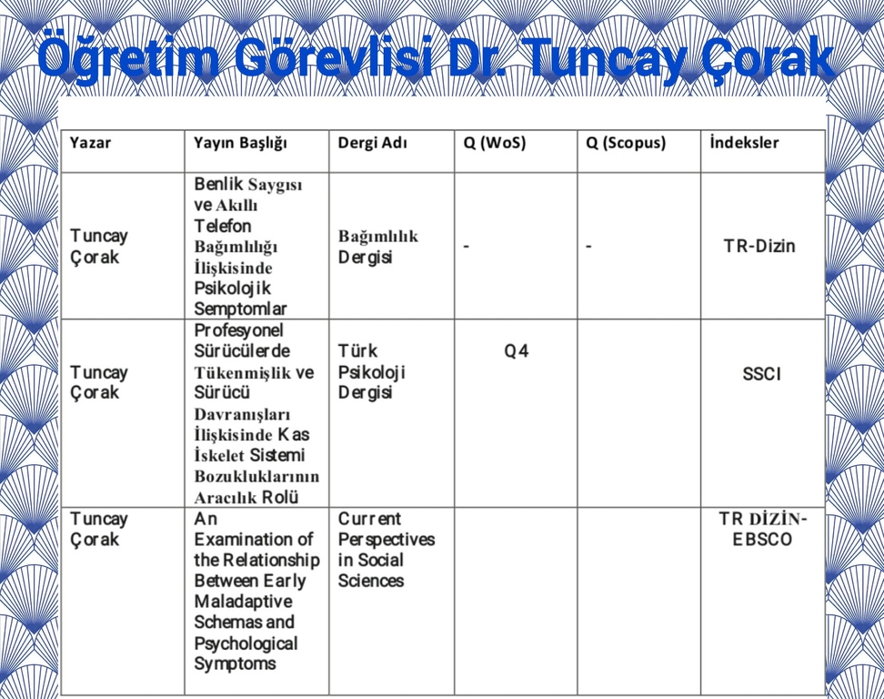 Tuncay Çorak: Davranışsal bağımlılıklar, sürücü davranışları ve psikolojik semptomlar üzerine hazırladığı çalışmasıyla TR-Dizin ve SSCI kapsamında akademik envantere katkı sağlamıştır.