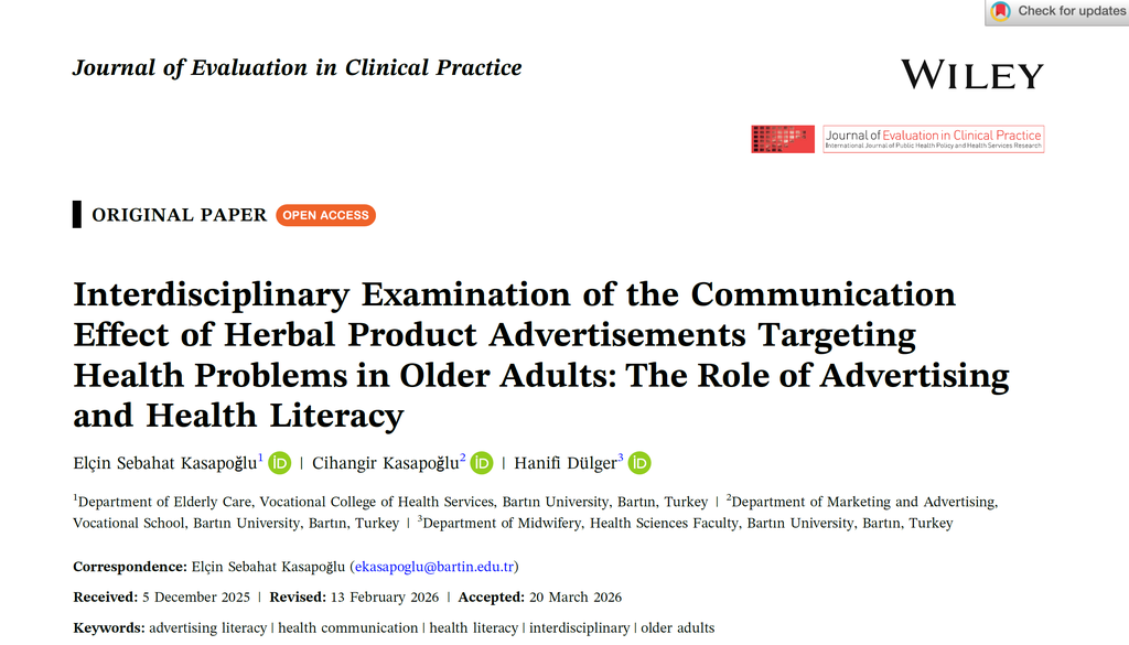 1. E. S. Kasapoğlu, C. Kasapoğlu ve H. Dülger, “Yaşlılarda Sağlık Sorunlarını Hedefleyen Bitkisel Ürün Reklamlarının İletişim Etkisinin Disiplinlerarasının İncelenmesi: Reklam ve Sağlık Okuryazarlığının Rolü”, Klinik Uygulamada Değerlendirme Dergisi 32 (2026): e70428.