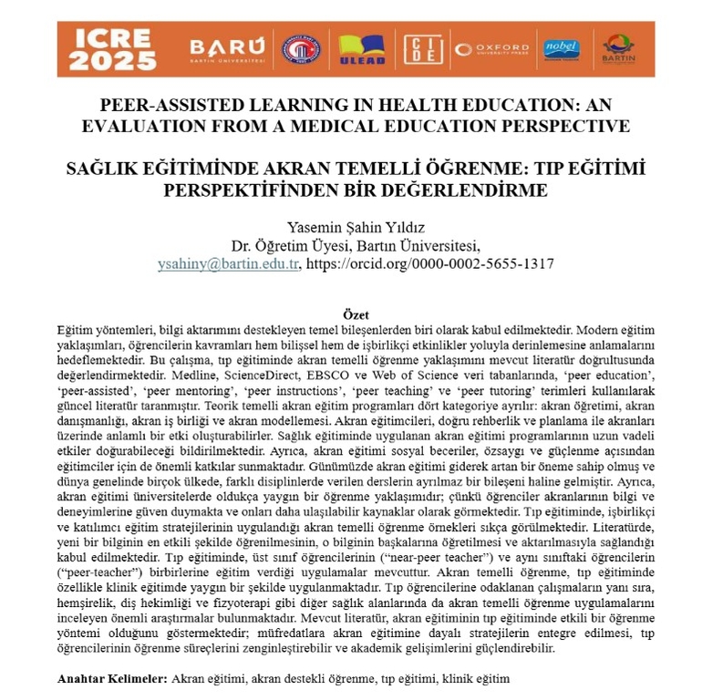 1. Şahin Yıldız, Y. (2025, Aralık 31). Peer-assisted learning in health education: An evaluation from a medical education perspective. 20th International Congress of Research in Education
