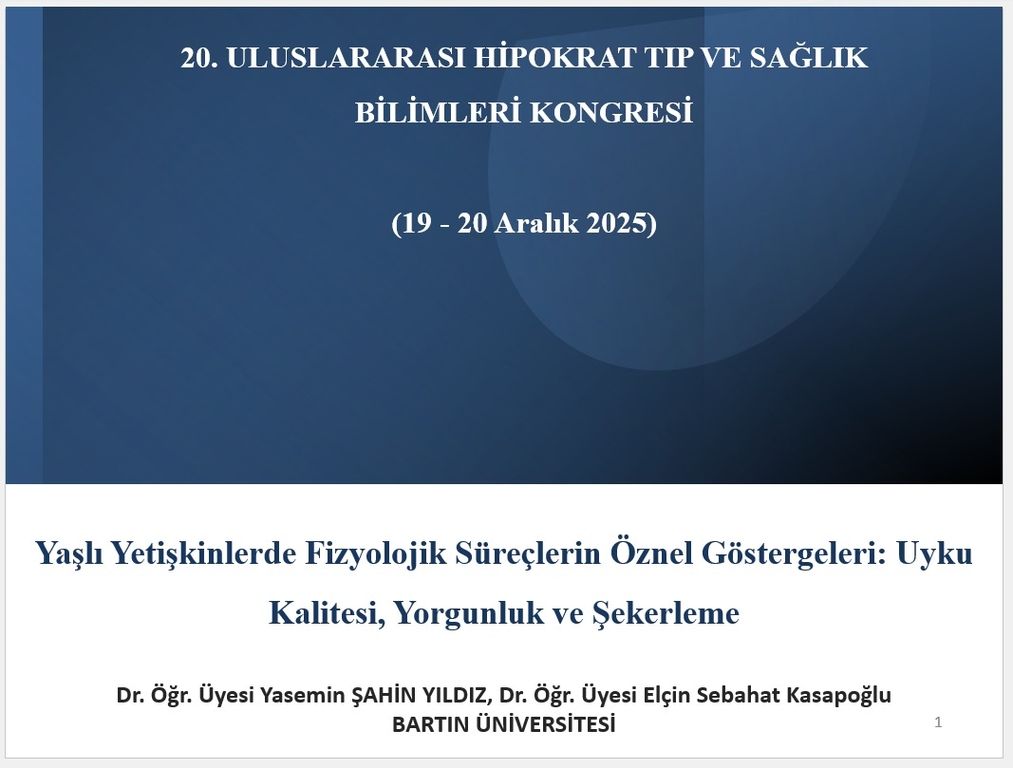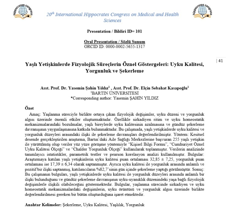 2. Şahin Yıldız, Y., & Kasapoğlu, E. S. (2025, Aralık 21). Yaşlı yetişkinlerde fizyolojik süreçlerin öznel göstergeleri: Uyku kalitesi, yorgunluk ve şekerleme. 20th International Hippocrates Congress on Medical and Health Sciences