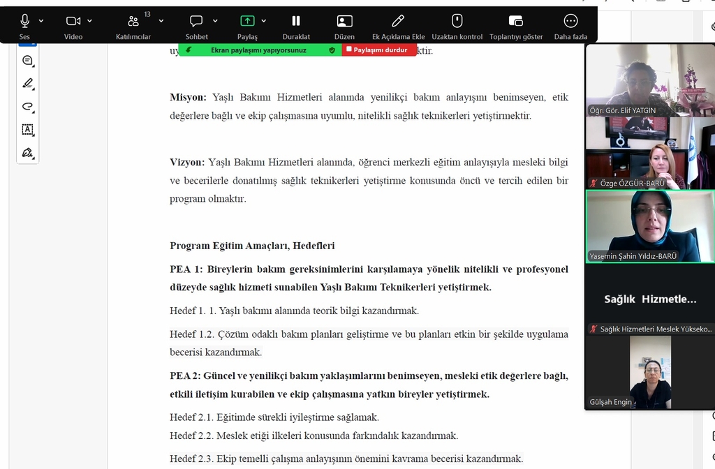 Toplantı, yüksekokulumuz bünyesinde yer alan Çocuk Gelişimi, Yaşlı Bakımı ile Tıbbi Dokümantasyon ve Sekreterlik programlarının, Sağlık Bilimleri Eğitim Programları Değerlendirme ve Akreditasyon Derneği (MEDEK) akreditasyon hazırlık çalışmaları kapsamında düzenlendi. Gündem maddeleri doğrultusunda gerçekleştirilen toplantıda, ilgili programlara yönelik önemli başlıklar ele alındı.