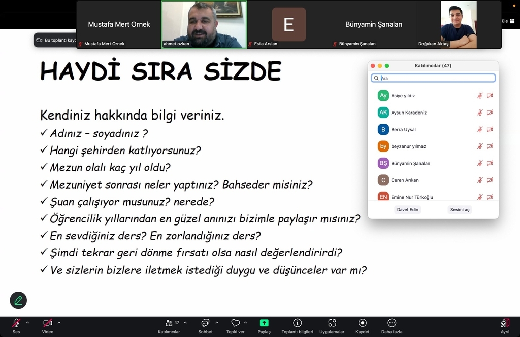 Yaşlı Bakımı Programı, Öğr. Gör. Arzu Tazegün Özsezgin moderatörlüğünde düzenlenen “Mezunlar Buluşması” etkinliğiyle mezunlarımız Alican Şeker ve Koray Purtul’u ağırladı. Mezunlar, atanma süreçlerinden KPSS hazırlığına kadar birçok konuda öğrencilerle tecrübelerini paylaştı.